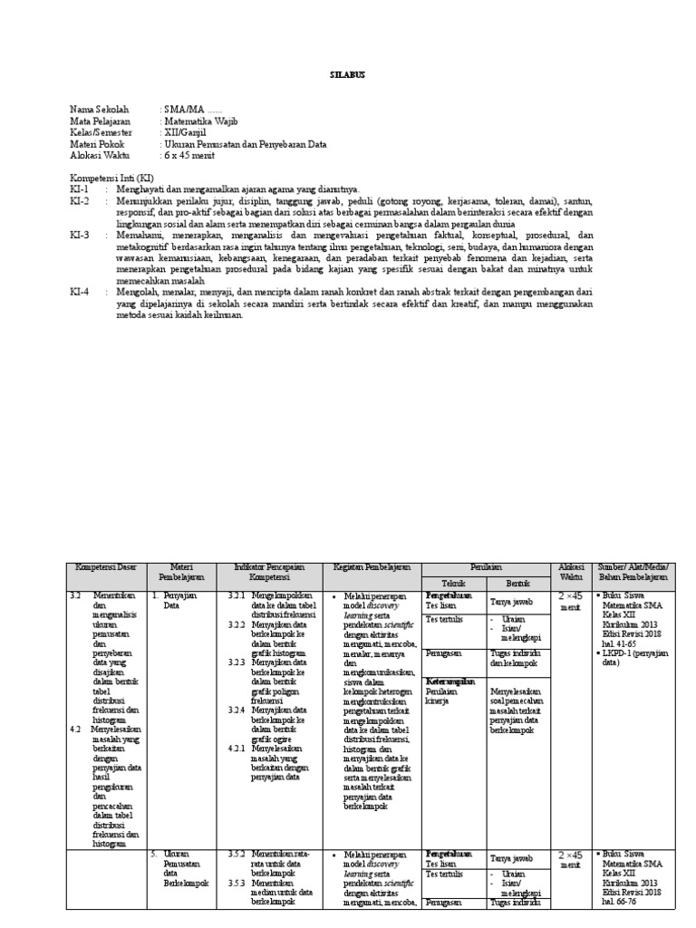 Dapatkan juga perangkat pembelajaran matematika wajib sma lainnya seperti prota, promes. Silabus kurikulum 2013 sd pdf. Semua materi di bawah ini disusun dengan teratur di mulai dari materi geometri bidang datar, geometri bidang ruang, statistika, data tunggal, penyajian data, data berkelompok, kaidah. Oleh karena itu kesiapan untuk mengimplementasikan pembelajaran di kelas merupakan tugas dan tanggung jawab bagi setiap pendidik untuk melengkapi administrasi kelas diantara yaitu silabus dan. Di sini kami sediakan materi untuk pelajaran matematika wajib sma kelas xii kurikulum 2013 revisi 2018.